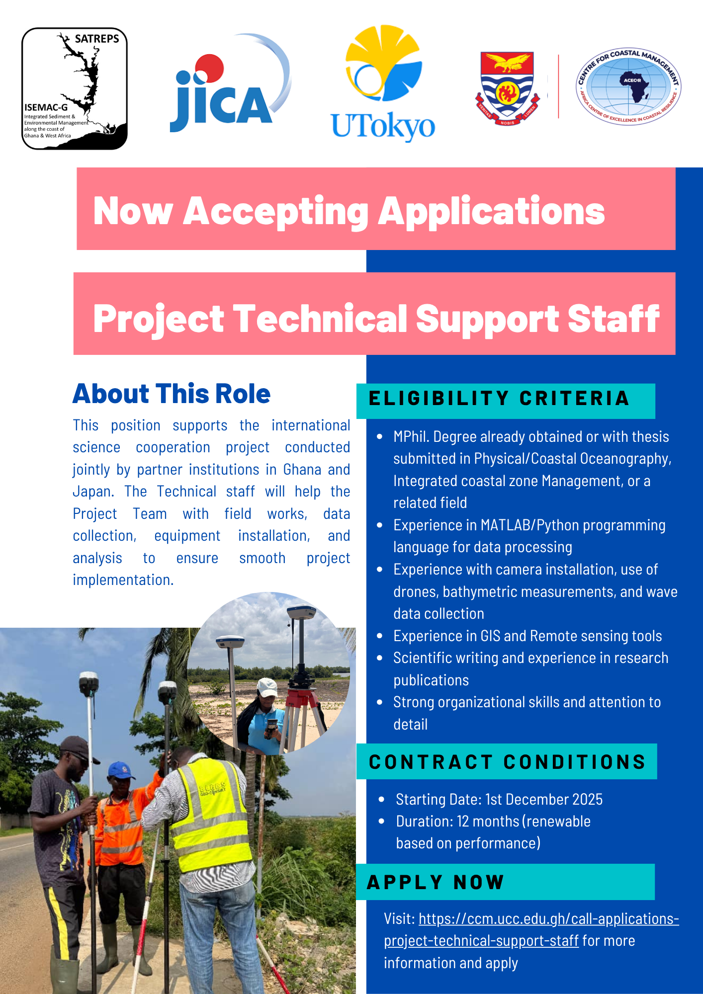 This position supports the international science cooperation project conducted jointly by partner institutions in Ghana and Japan. The Technical staff will help the Project Team with field works, data collection, equipment installation, and analysis to ensure smooth project implementation.